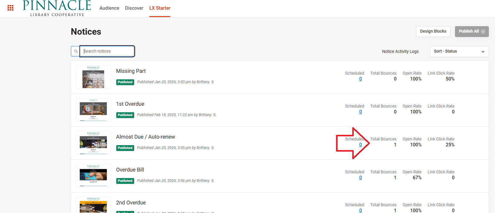 1. Once on a library branch, click 'LX Starter'. That will open a page that lists each notice. On the right hand side of each notice is a dashboard of statistics, which includes bounces. A number will appear under 'bounces' if any soft or hard bounces have occurred.